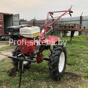 В комплекте к мотоблоку находятся большие колеса 7*12, что повышает возможность сцепления с поверхностью земли, при этом придаёт мотоблоку более быструю скорость, в данной ситуации к месту используется первая передача, на которой мотоблок работает, имея скорость, не превышающую 3-5км/ч.